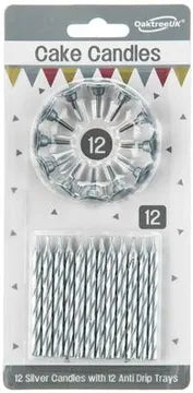 Spiral Cake Candles Metallic Silver 12 Candles and 12 Holders