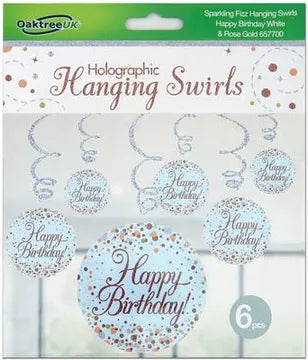 Oaktree Sparkling Fizz Hanging Swirls Happy Birthday White & Rose Gold 6pcs