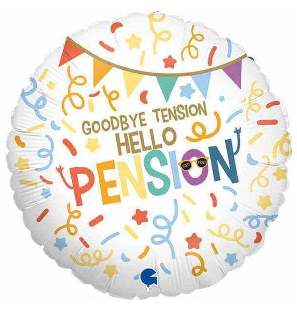 18" Goodbye Tension Hello Pension Foil Balloon Packaged