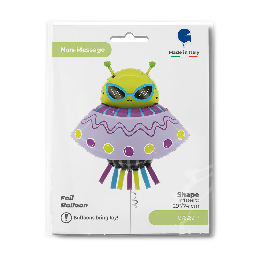 Make your party décor out of this world with our 29″ Funky Alien Foil Balloon. This colourful character features a bright green alien rocking retro blue sunglasses and flying in a vibrant purple UFO. Perfect for space-themed birthdays, sci-fi celebrations, and galaxy-inspired events, it’s a guaranteed crowd-pleaser for kids and adults alike. Pair with rocket, planet, or star balloons for a truly stellar display. Suitable for helium inflation to float or air inflation for creative displays.