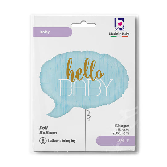 24 inch Blue Hello Baby Speech Bubble Foil Balloon Packaged