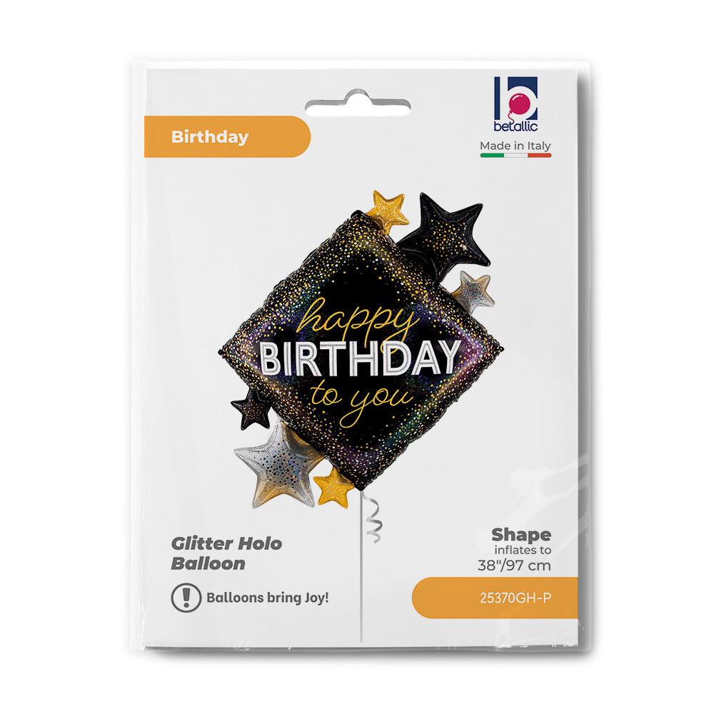 Bold, eye-catching and full of sparkle, this 38 inch Happy Birthday To You Glitter Holographic Shape Balloon features a striking black background with shimmering holographic glitter effects and star accents. The modern “happy Birthday to you” design makes it a standout feature for birthday celebrations of all ages.